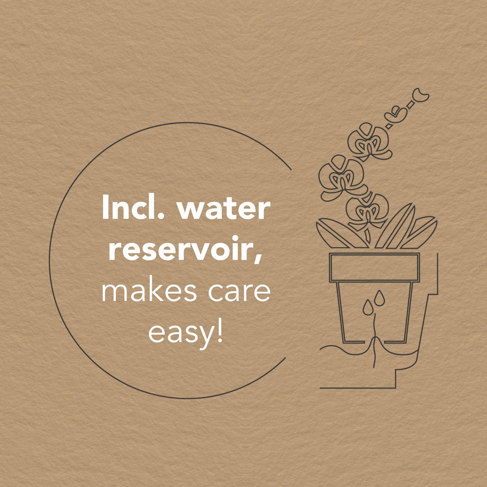Was dieses Orchideen-Set einzigartig macht, ist das intelligente, selbstversorgende Wasserreservoir. Dank des Reservoirs erhalten die Orchideen stets genügend Feuchtigkeit, ohne dass ständige Pflege erforderlich ist. Ideal für alle, die schöne Orchideen genießen möchten, ohne viel Aufwand.