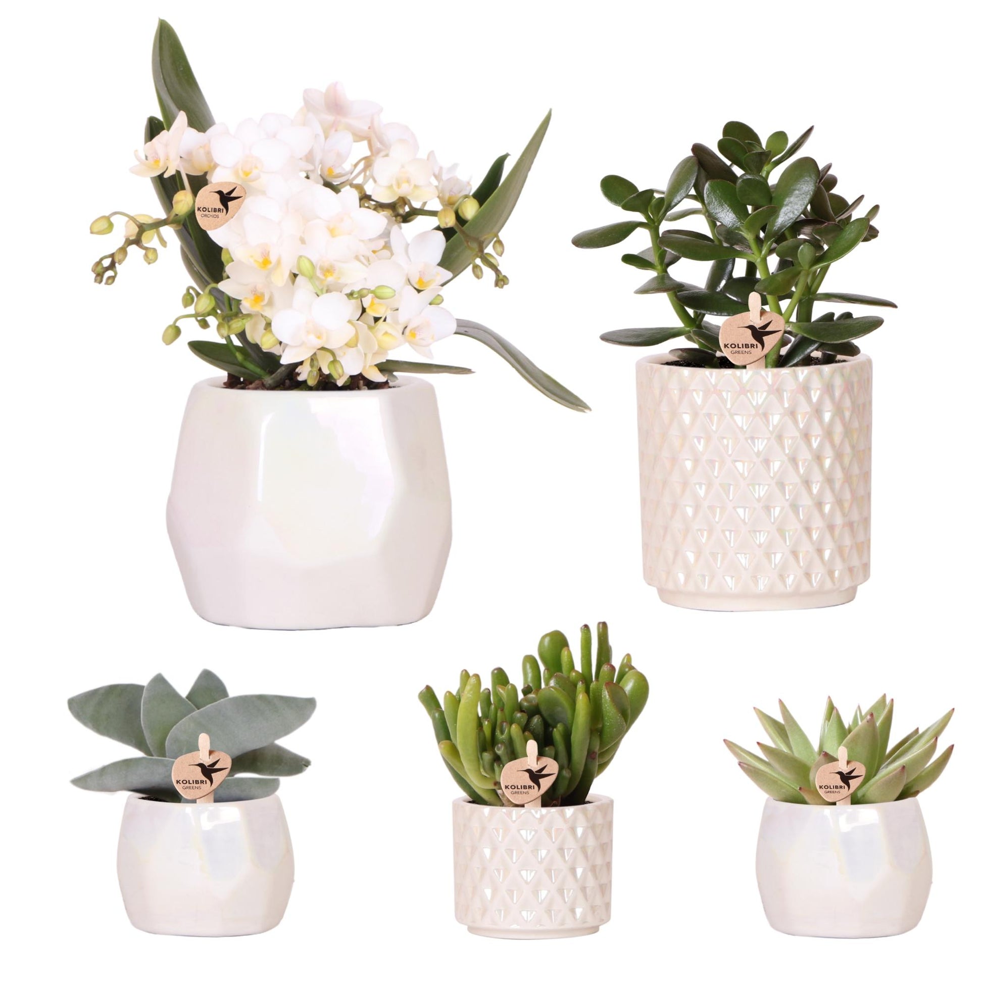 1 x Leonor (Phalaenopsis Nazaré) 9 cm, 1 x Crassula Ovata 9 cm, 1 x Crassula Boomerang 6 cm, 1 x Crassula Hobbit 6 cm, 1 x Echeveria Miranda 6 cm, 1 x Pearl Pot travertine 9 cm, 1 x Diamond Pearl Pot travertine 9 cm, 2 x Pearl Pot travertine 6 cm, 1 x Diamont Pearl Pot 6 cm