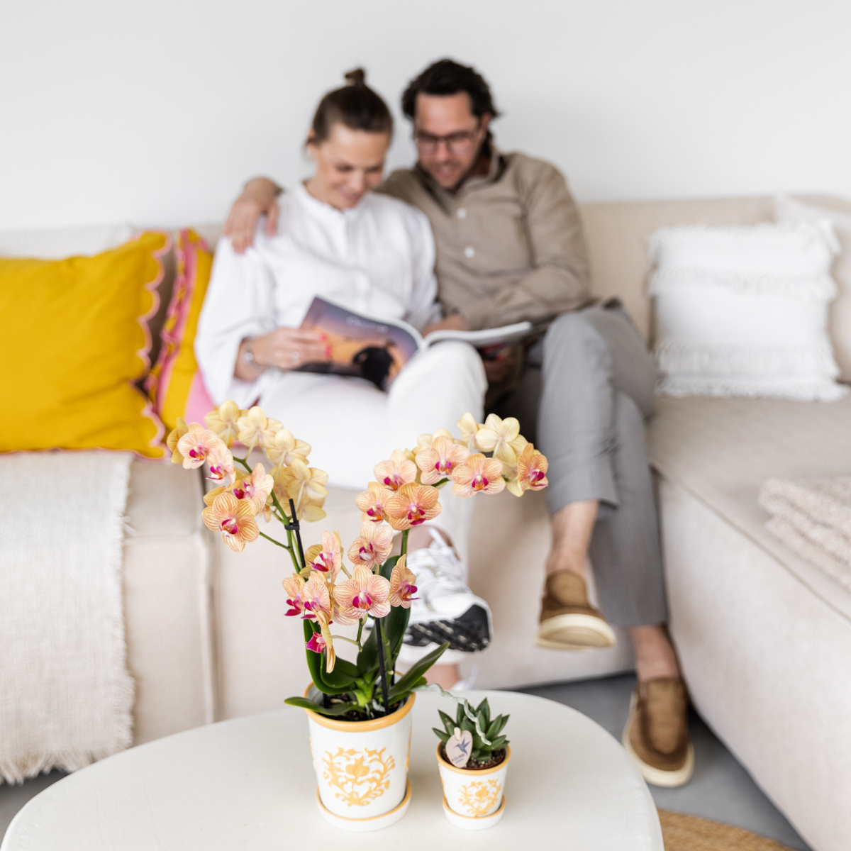 Eine perfekte Kombination, die sofort ein sommerliches Gefühl ins Haus bringt! Die Kolibri Orchids Lima ist ein bezaubernder Anblick mit ihrer kompakten Größe und auffälligen Blüten. Die Stiele sind etwas kürzer, was sie umso niedlicher macht. Die Blüten strahlen in einem warmen Gelbton mit einem wunderschönen roten Muster und einer eleganten violetten Lippe.